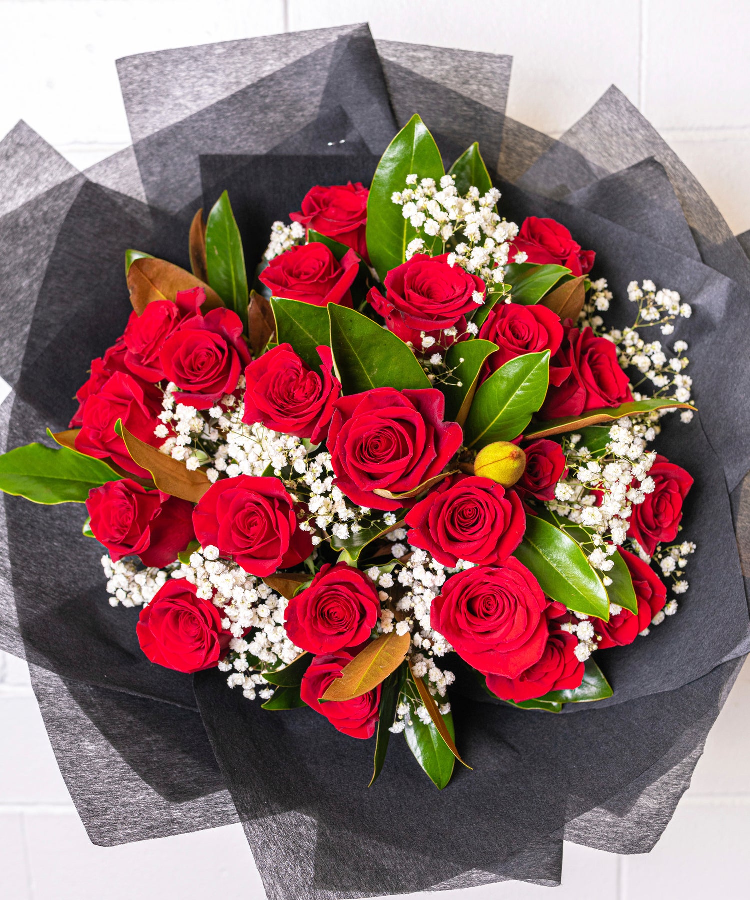 Red Roses mixed with seasonal greenery and baby's breath. A classic love statement.